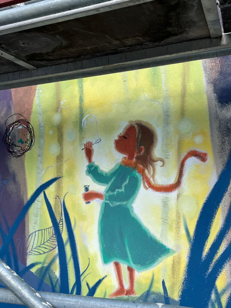 La peinture représente une scène onirique : un arbre majestueux, des feuillages vibrants, et une silhouette en interaction avec l’environnement. Chaque détail évoque la douceur, la curiosité et le lien entre l’humain et le vivant. L’intégration dans le paysage urbain est fluide, naturelle, et invite à la contemplation.