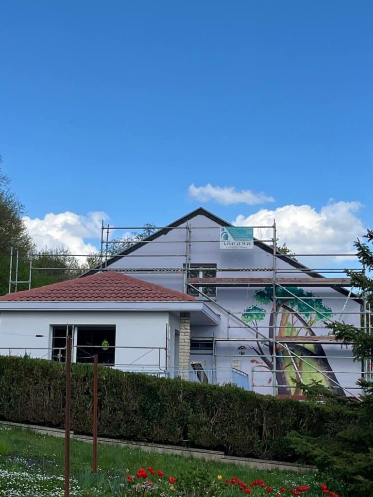 Dans le cadre d’un projet de valorisation esthétique, Groupe Reno a accompagné la réalisation d’une fresque murale unique, mêlant art et architecture. Cette œuvre, peinte directement sur la façade d’une maison, transforme le bâtiment en support narratif et visuel.